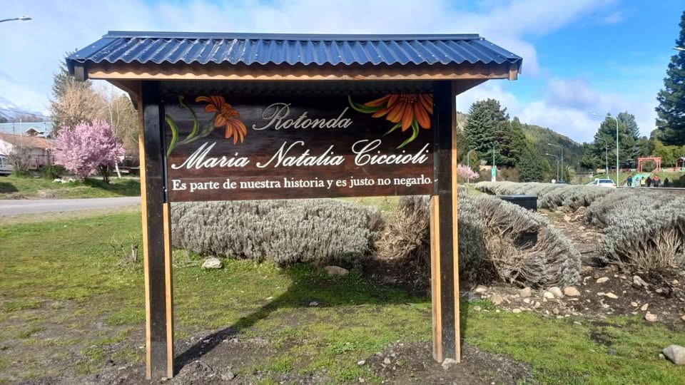 En el cartel se instaura el nombre de la rotonda, y la frase “Rotonda María Natalia Ciccioli Es parte de nuestra historia y es justo no negarlo”. Dos mutisias, la flor emblema de nuestra ciudad, rodean su nombre.