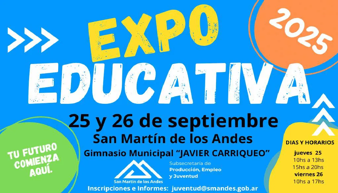 El Departamento de Juventud de la Municipalidad de San Martín de los Andes anunció la Expo Educativa 2025, un evento fundamental para la orientación vocacional de los jóvenes de nuestra región. La cita es el jueves 25 y viernes 26 de septiembre de 2025 en el Gimnasio Municipal “Javier Carriqueo”,