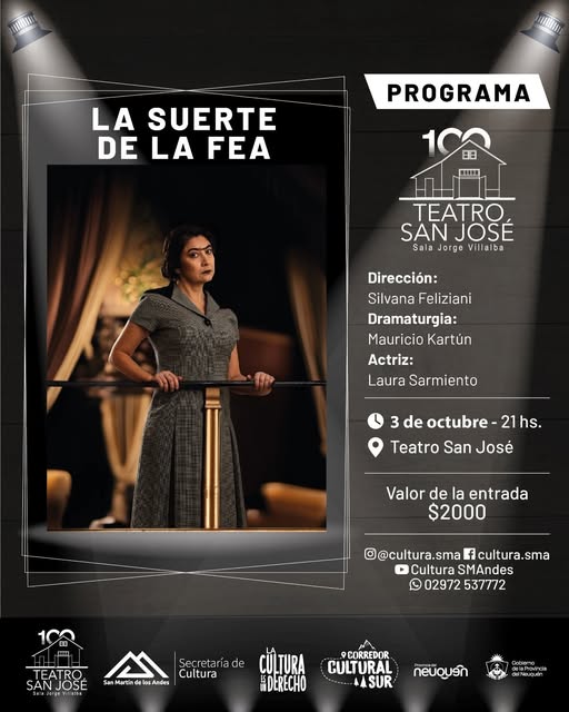 El viernes 3 de octubre a las 21.00 hs, llega al Teatro San José la obra “La Suerte de la Fea”, del grupo Las Furias Teatro (Neuquén), con dramaturgia de Mauricio Kartún, dirección de Silvana Feliziani y actuación de Laura Sarmiento.