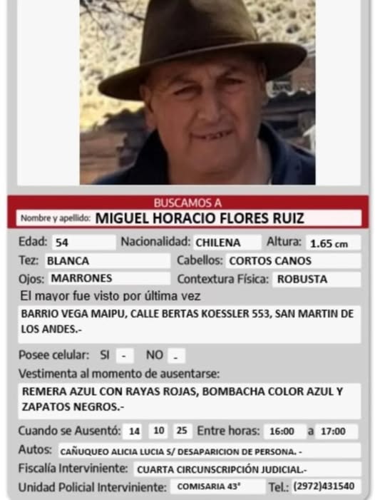 Tras varias horas de búsqueda, fue encontrado sin vida Miguel Horacio Flores Ruiz, un vecino de 54 años que era intensamente buscado desde su desaparición en el Barrio Vega Maipú.