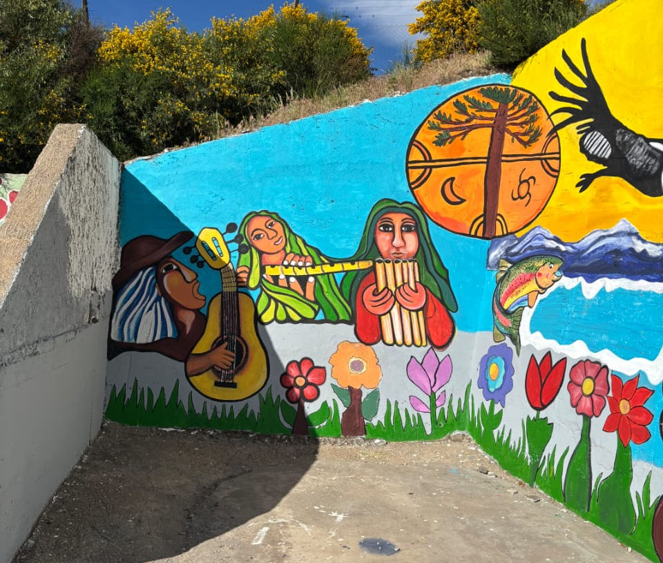 El mural de la escuela de Payla Menuco inaugurado es producto de una creación colectiva en la que, además del artista chileno, participaron los docentes Adriana Ramírez y Heber López.