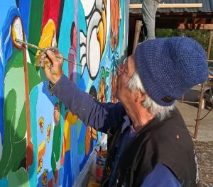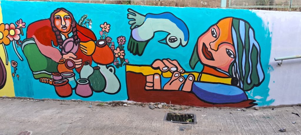 Durante una visita del artista chileno en mayo pasado, se analizó el proyecto de muralismo, que se concretó en una acción colectiva entre el 17 al 28 de noviembre. Cada estudiante aportó su boceto, un trazo, una idea, una mirada, acompañados por las docentes y por las familias.
