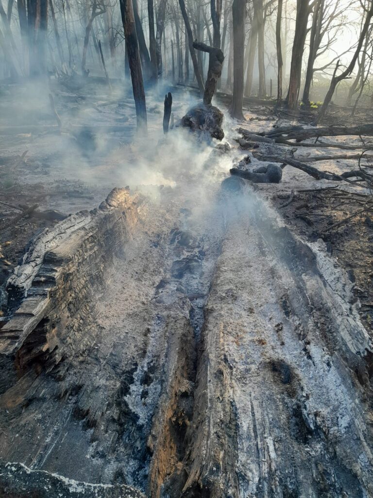 El incendio afectó principalmente material orgánico del suelo (raíces y materia vegetal en descomposición), así como troncos de araucarias, presentando una propagación lenta, baja visibilidad de llama y focos calientes persistentes, lo que requirió tareas minuciosas de detección, remoción y enfriamiento.