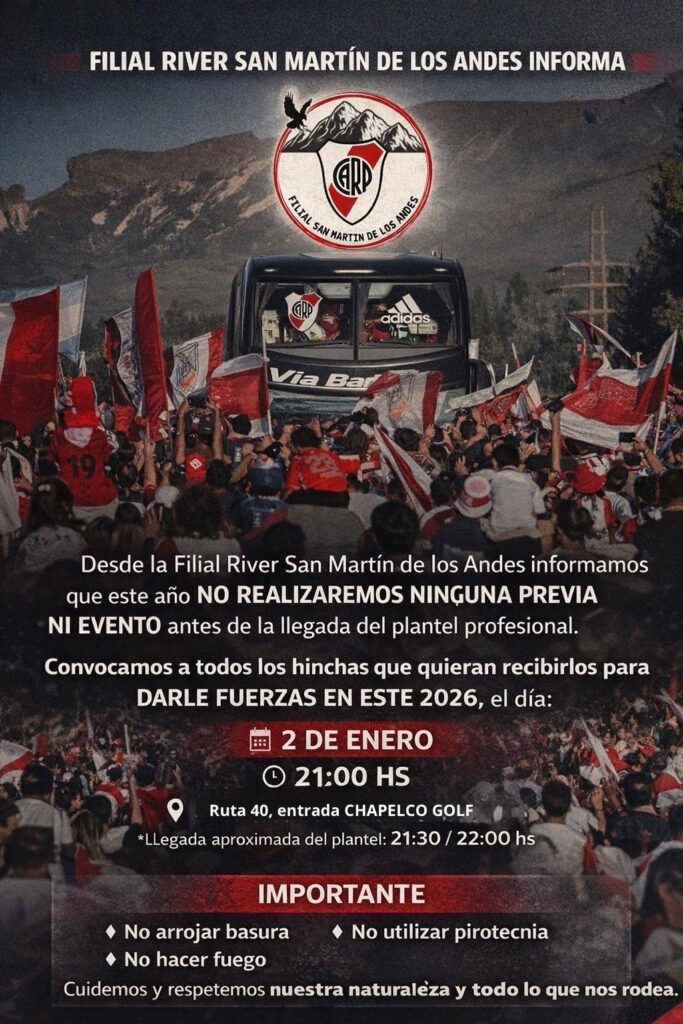 River llegará a San Martín de los Andes este viernes 2 de enero de 2026 a la noche, alrededor de las 21.00 hs y se espera un recibimiento masivo afuera del Loi Suites Chapelco donde se hospedará el plantel.