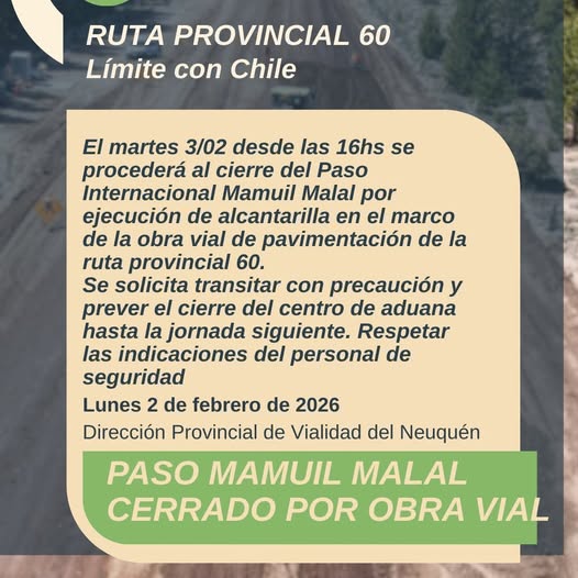 La dirección provincial de Vialidad informó que este martes 3 de febrero de 2026, a partir de las 16.00 hs, se procederá al cierre del paso internacional Mamuil Malal por la de ejecución de una alcantarilla como parte de la construcción de pavimento en la ruta provincial 60, desde el fin de pavimento hasta el límite con Chile.