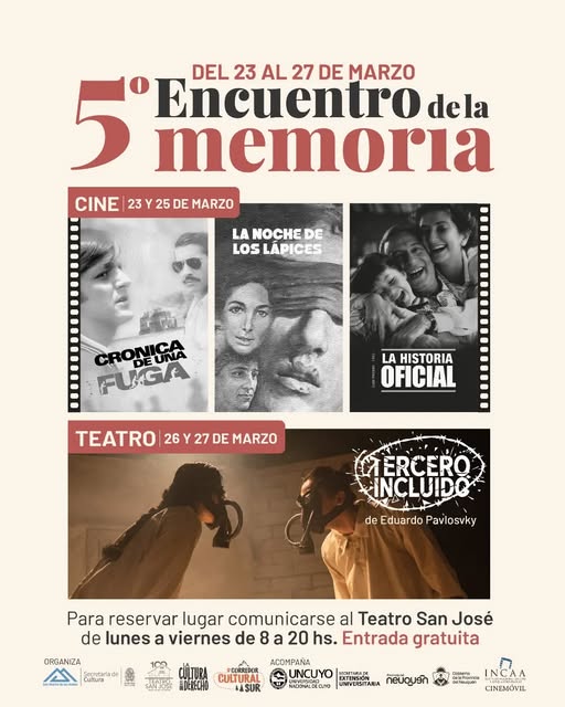 La propuesta incluye funciones teatrales del prestigioso Elenco de Teatro de la Universidad Nacional de Cuyo, con la obra “Tercero Incluido”, de Eduardo Pavlosvky, y proyecciones de películas nacionales vinculadas a la época de la dictadura.