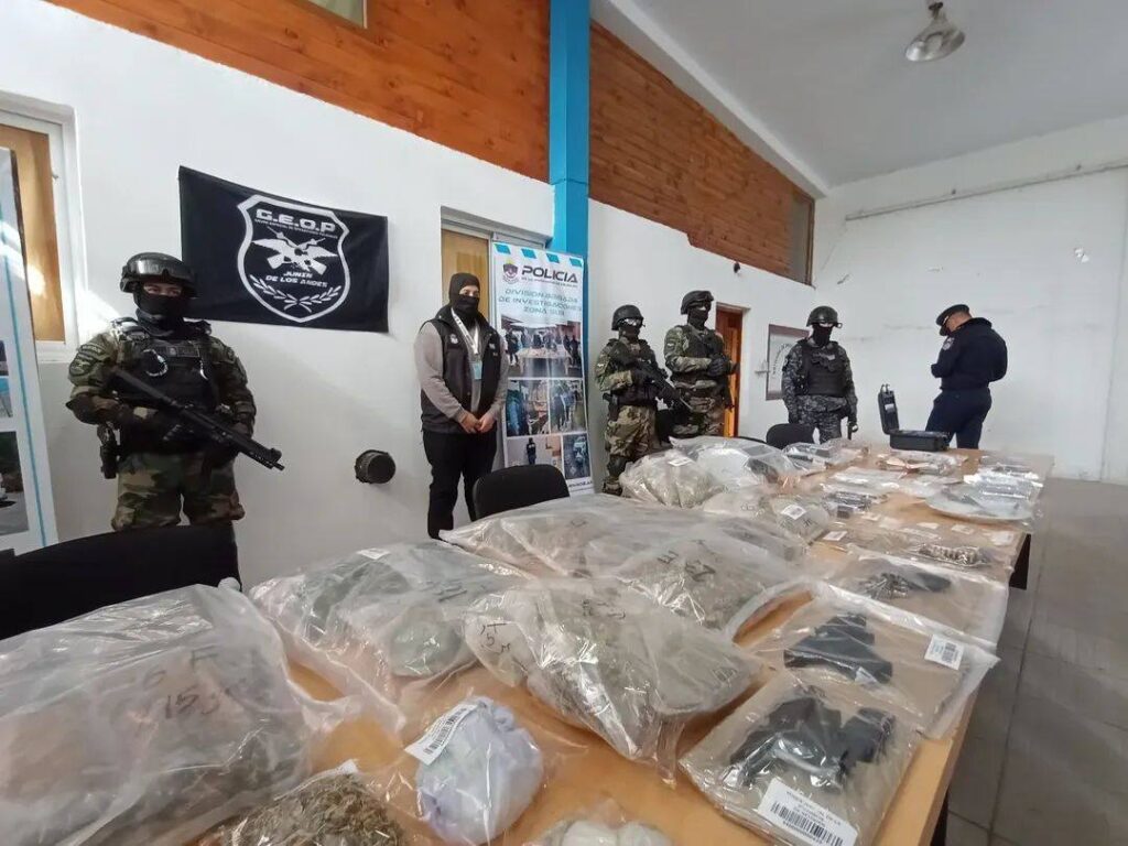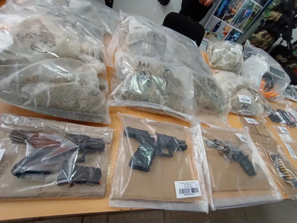 Unos 10 kilogramos de cocaína y marihuana, armas de grueso calibre, 12 millones de pesos y 1350 dólares en billetes fueron secuestrados en el allanamiento de una vivienda en el Barrio Las Rosa de San Martín de los Andes durante operativos que derivaron, además, en la detención de dos personas.